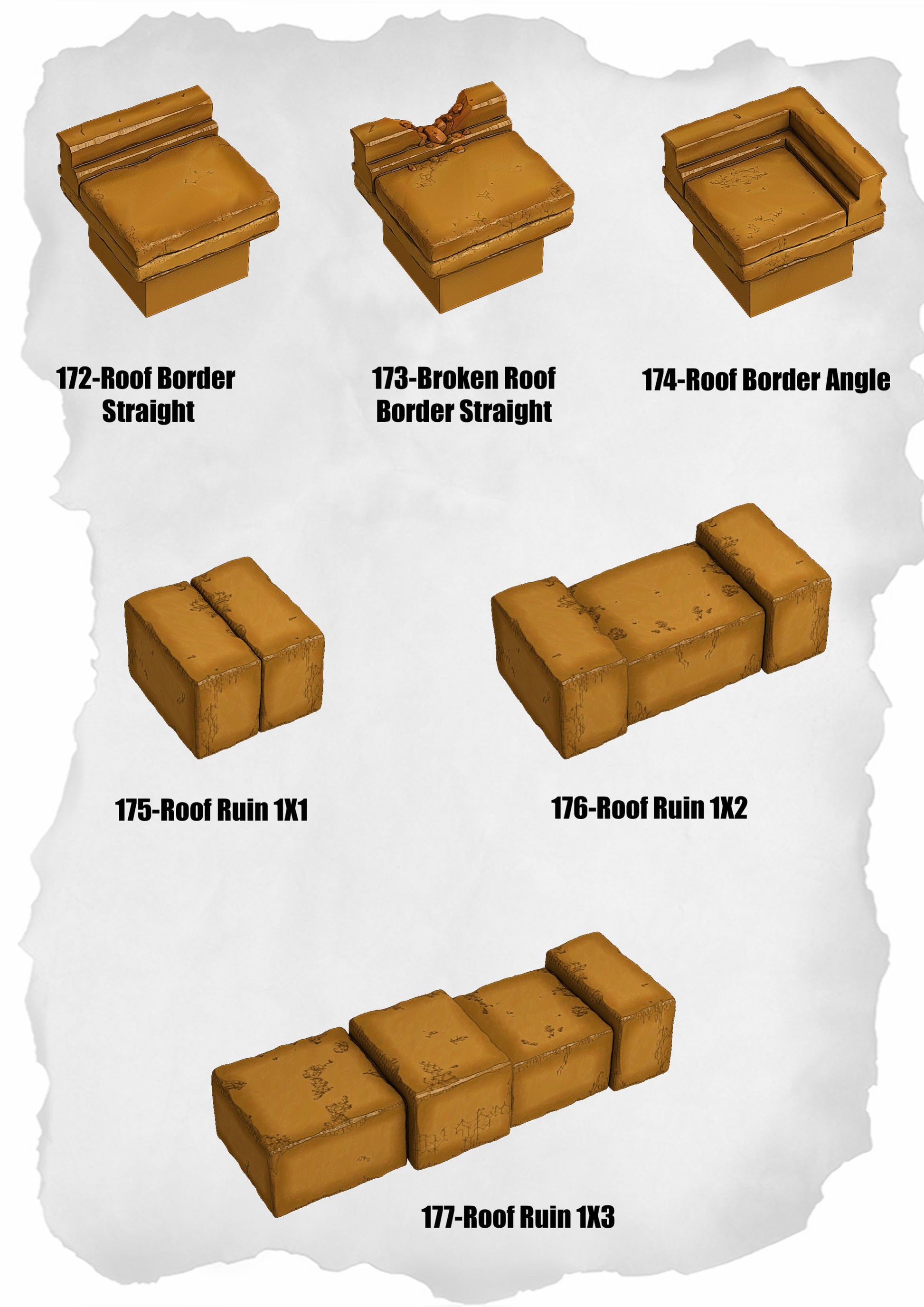 Includes both intact and broken roof edges and decorative flat roof sections in multiple sizes — great for modular rooftops or raised terrain elements.